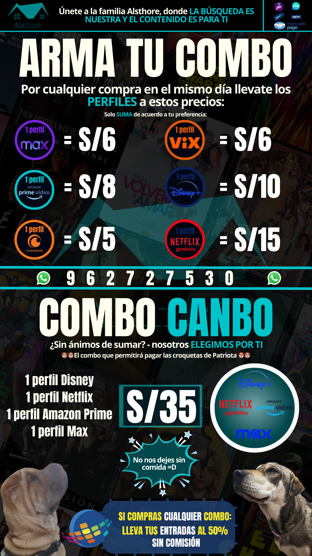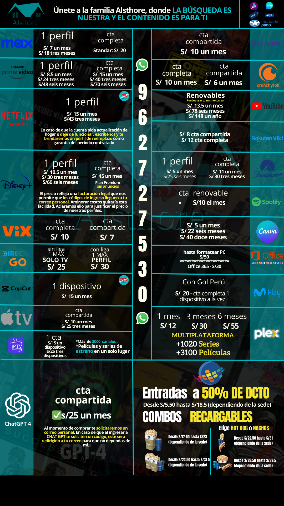 Disponemos de la gran mayoría de servicios Streaming a un precio incríblemente económico. Damos soporte y garantía a nuestros clientes y quincenalmente lanzamos nuevas ofertas, conoce nuestras ofertas actuales haciendo clic abajo u observa nuestro flyer abajo.
